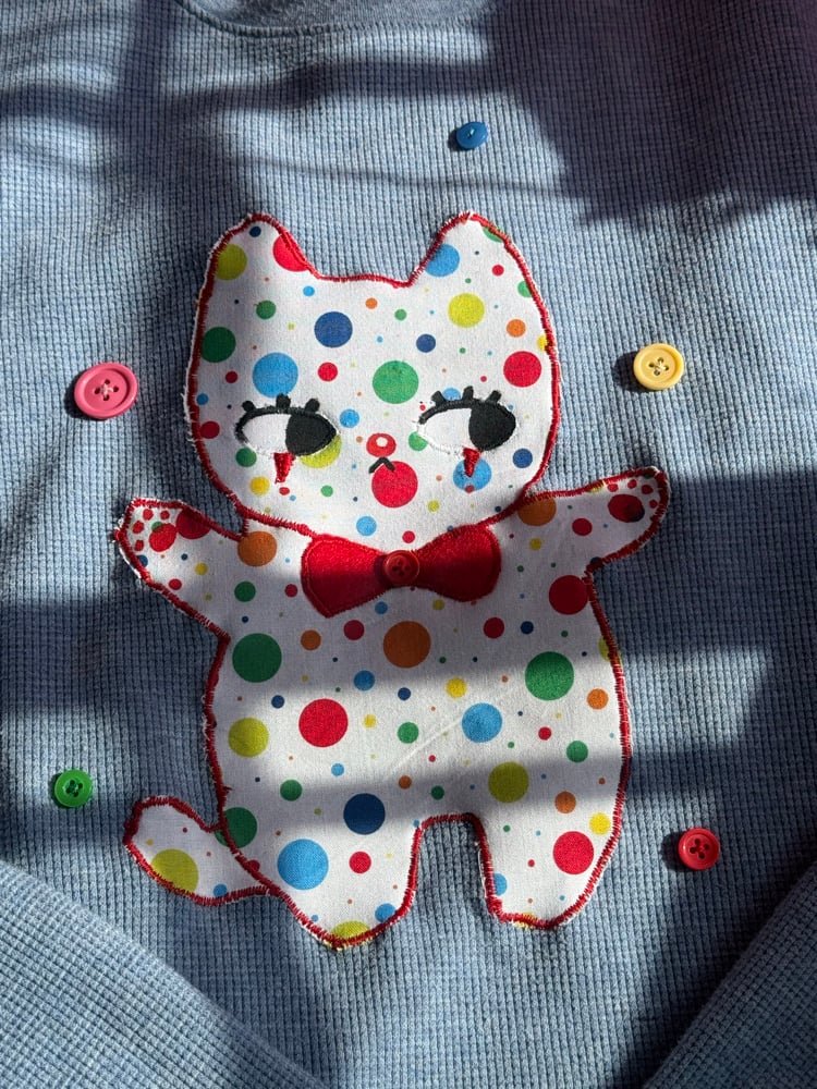 polka dot clown kitty with a tiny bow + button details (。•́‿•̀。)♡playful, soft, and a little strange in the cutest way ✿